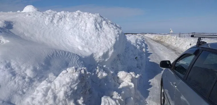 На фотографиях видно, что ширина трассы не позволяет разъехаться двум машинам, а сугробы превышают высоту автомобиля.