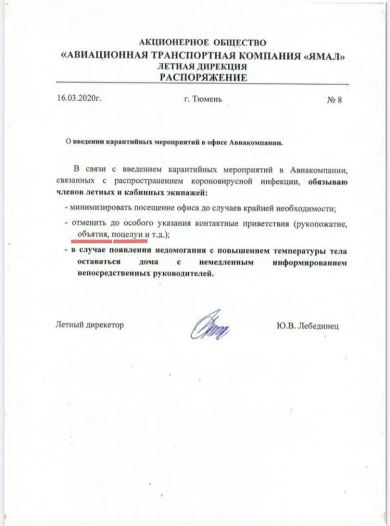 «…обязываю членов летных и кабинных экипажей: отменить до особого указания контактные приветствия (рукопожатие, объятия, поцелуи и так далее)», — говорится в документе.