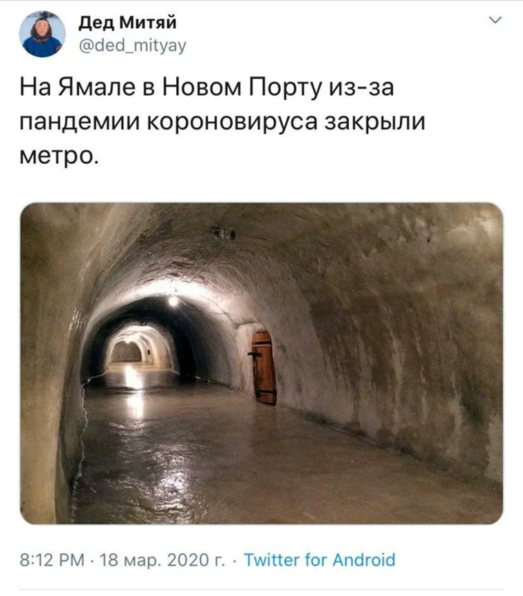 «На Ямале в Новом Порту из-за пандемии закрыли метро», — гласит подпись под фото пустого тоннеля мерзлотника. Мем, появившийся в Twitter, был скопирован администраторами групп в «ВКонтакте» и каналов в Telegram.