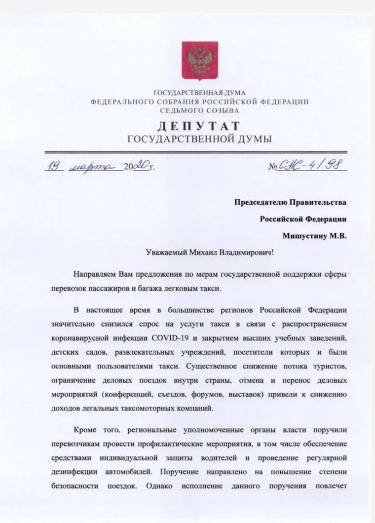 Депутат Госдумы Александр Старовойтов (ЛДПР) направил письмо премьер-министру Михаилу Мишустину, в котором предложил правительству РФ ввести для таксистов налоговые и кредитные каникулы, рассмотреть возможность предоставления льготных субсидий и продлить сроки действия полисов ОСАГО. Копия документа есть в распоряжении URA.RU.