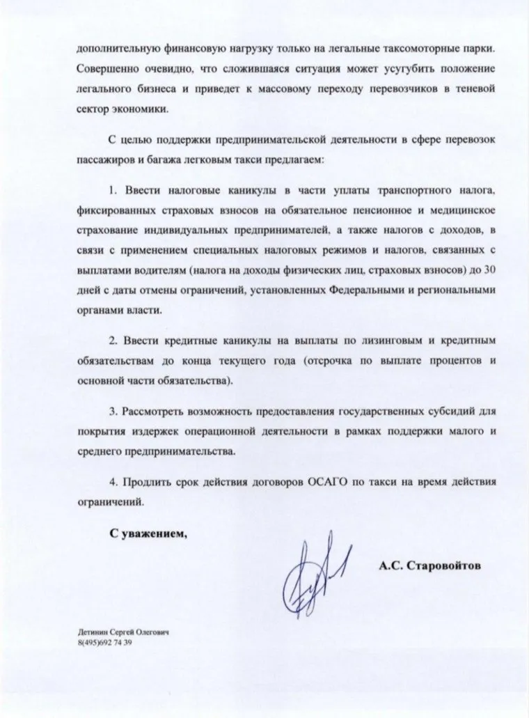 Чтобы поддержать такси депутат предлагает ввести налоговые каникулы в части уплаты транспортного налога, страховых взносов, а также налогов с доходов. Старовойтов также считает необходимым ввести кредитные каникулы по лизинговым и кредитным обязательствам до конца 2020 года. Предлагается также предоставить субсидии компаниям для покрытия издержек операционной деятельности. Кроме того, депутат просит продлить действие договоров ОСАГО для такси на время действия ограничений.