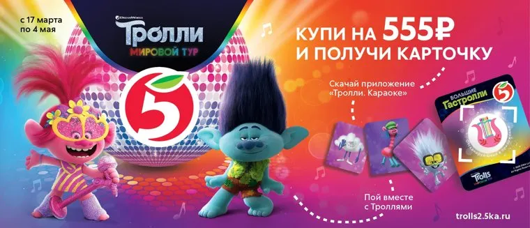 «За каждые 555 рублей в чеке до 4 мая гости магазинов будут получать карточку с 3D-эффектом с изображением героев фильма», — комментируют акцию в торговой сети. Если ее отсканировать с помощью приложения «Тролли. Караоке», то можно получить доступ к караоке-мелодиям.