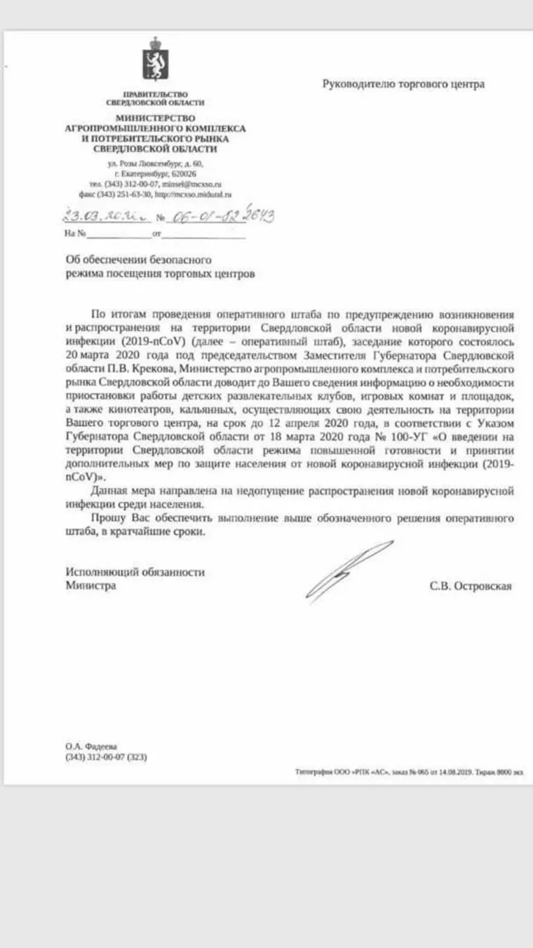 Также в распоряжении URA.RU оказался скан письма министра агропромкомплекса и потребительского рынка Свердловской области Светланы Островской неизвестному руководителю ТРЦ (его фамилия и название центра замазаны). В нем говорится о необходимости остановить работу детских клубов и игровых комнат, а также кинотеатров и кальянных.