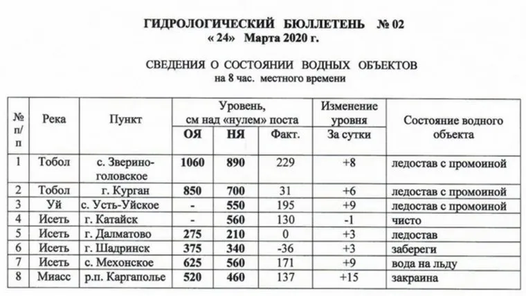 В гидрологическом бюллетене центра по гидрометеорологии говорится, что наибольшее повышение уровня воды за сутки (+15 см) зафиксировано на реке Миасс в районе поселка Каргаполье. Река Исеть у села Мехонское и река Уй в селе Усть-Уйское поднялись на 9 см. Тобол в пределах села Звериноголовское прибавил 8 см.