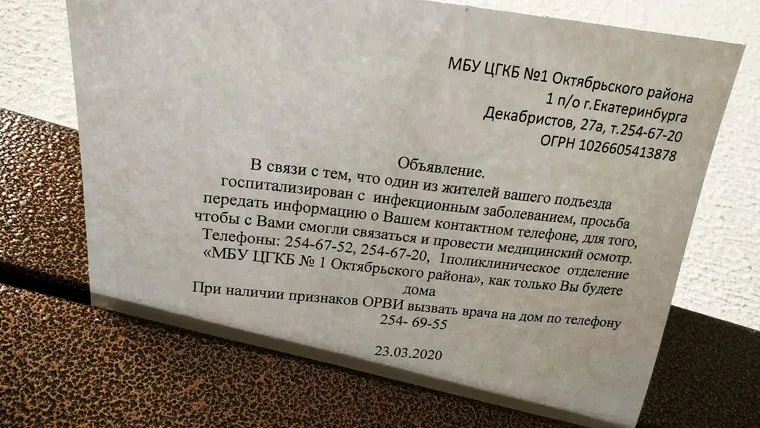 Карантин объявили после госпитализации двух человек, вернувшихся из Испании. «Накануне вечером люди в защитных костюмах увезли на скорой двоих человек, вернувшихся 19 марта из Испании, — рассказал агентству житель дома Вячеслав. — Видимо, у них подтвердился диагноз. Сегодня с утра пришли из детской поликлиники. У тех детей, у кого есть признаки ОРВИ, взяли мазок из горла. А потом пришли из взрослой поликлиники и переписали всех проживающих. Сказали, если появятся признаки ОРВИ, — звонить. Тем, кого не было дома, воткнули в дверь оповещения».