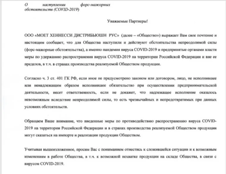 В письме, подписанном гендиректором Moet Hennessy в России Себастьеном Вильмо, также дается ссылка на российское законодательство, которое снимает с предпринимателей ответственность за ненадлежащие исполнение договоров, если причиной тому стали чрезвычайные обстоятельства. Журналист URA.RU отправил запрос на комментарий в пресс-службу компании, ответ пока не поступил.