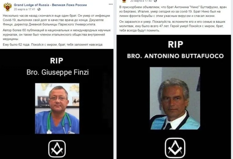 Пандемия коронавируса серьезно затронула российских масонов: среди тех людей, которые умерли от COVID-2019 в Европе, есть их единомышленники. На странице Великой Ложи России опубликованы портреты и некрологи погибшим масонам. Среди них, например, Джузеппе Финци, директор Дневной больницы Пармского Университета, и Антонина «Нино» Буттафуоко, врач из Бергамо, а также четверо масонов из Филиппин.