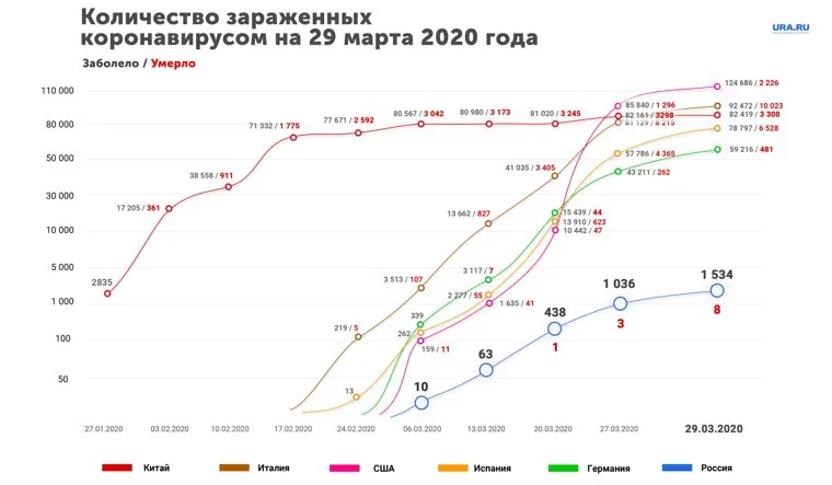 Среди других стран по-прежнему лидирует США — там к 29 марта зарегистрировано 124686 заболевших (за сутки +5978), 2226 человек умерли (+225). Там относительно невысокий уровень летальности (1,79%). Более серьезная ситуация в Италии — там 86498 случаев заражения (+5369 инфицированных), умерли 9134 (+919) человек. Летальность составляет 10,84%. Также серьезные сложности в Испании — там 78797 больных (+6464), скончались от коронавируса 6548 человек (+708). Летальность составляет 8,29%.