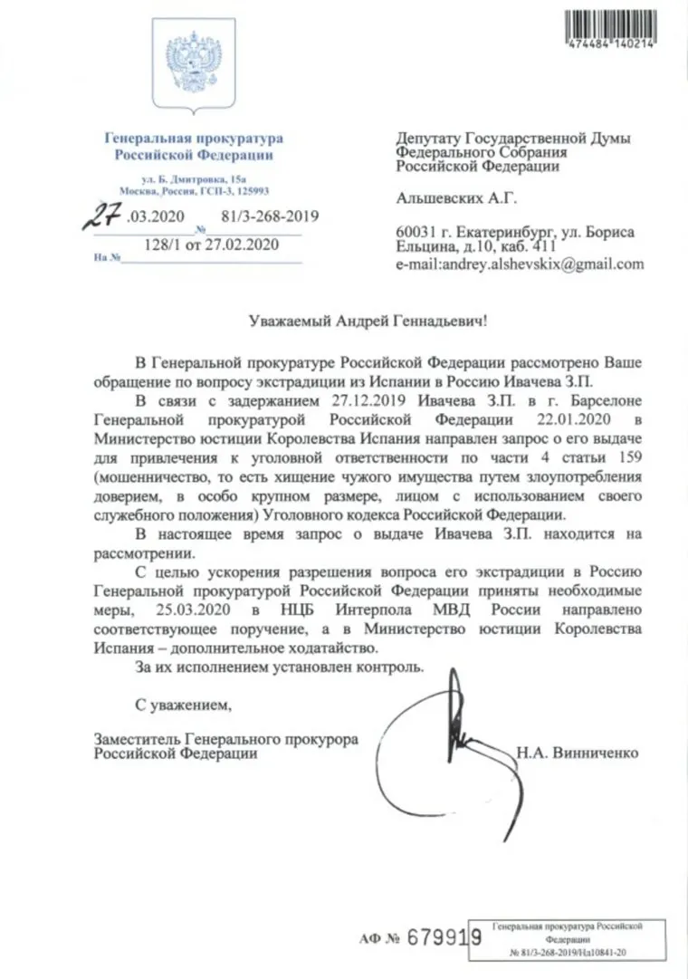 «С целью ускорения разрешения вопроса его экстрадиции в Россию Генеральной прокуратурой РФ приняты необходимые меры, 25 марта 2020 года в НЦБ Интерпола МВД России направлено соответствующее поручение, а в Министерство юстиции Королевства Испания — дополнительное ходатайство. За их исполнением установлен контроль», — говорится в документе.