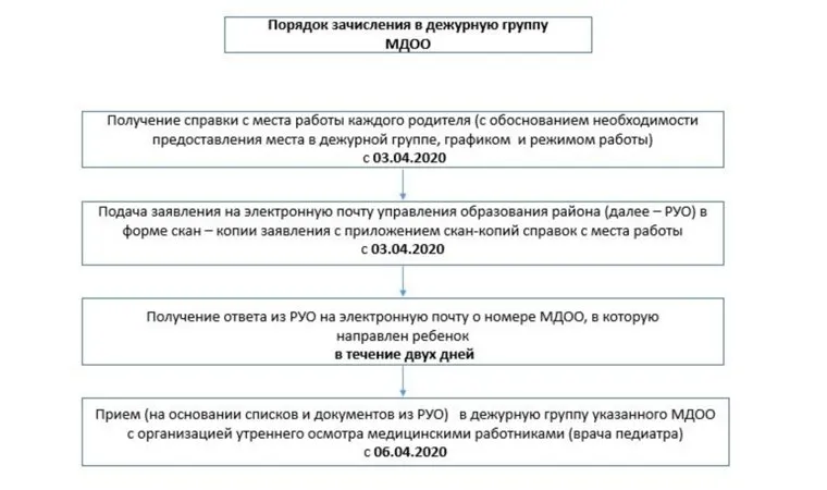 Схема устройства детей в дежурные группы следующая: родителю необходимо получить справку от работодателя с обоснованием необходимости предоставления места в дежурной группе, написать заявление и сканы обоих этих документов направить на электронную почту управления образования района. Районо должно дать ответ в течение двух дней. Прием детей начнется уже 6 апреля, в каждом из дежурных детсадов организуется осмотр детей врачом-педиатром.