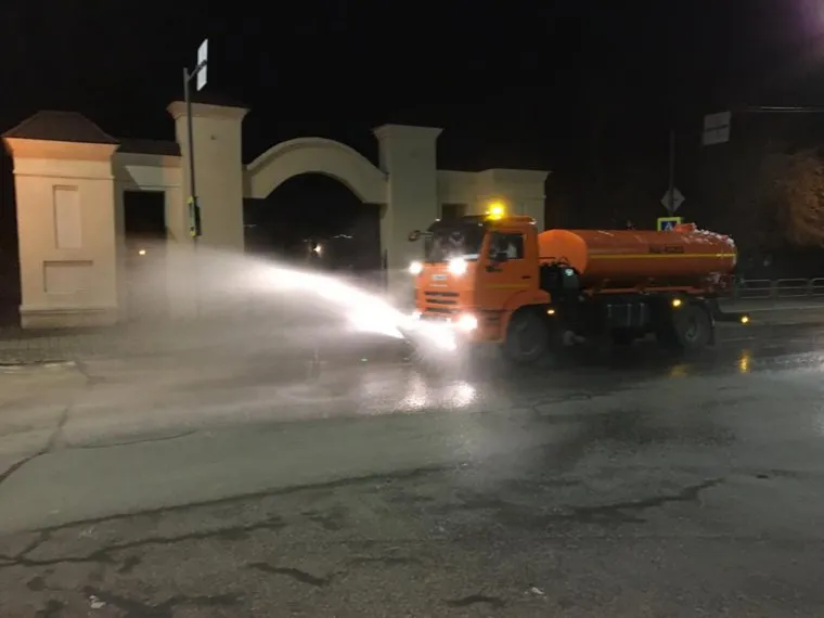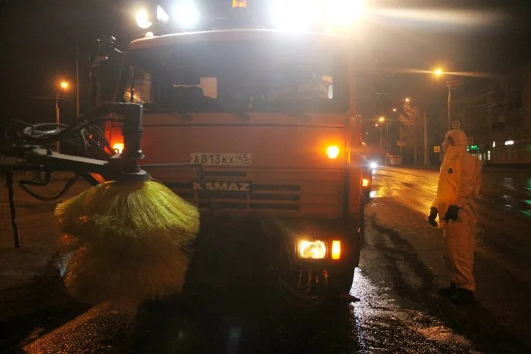 По данным пресс-службы городской администрации, обработка улиц, тротуаров и остановочных комплексов производится при помощи веерного распределения водного раствора. В связи с этим курганцам не рекомендуется в ночное время выходить из дома и выгуливать домашних животных. Тем, кто все-таки окажется в это время на улице, необходимо удаляться на безопасное расстояние от дорожной техники.