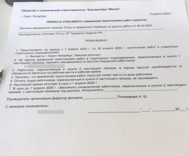 «От лица руководства компании „Золотое Яблоко“ сообщаем, что никаких решений о массовом увольнении сотрудников в компании не принималось и не готовится. В настоящее время в компании происходит изменение организационной структуры, в том числе, в соответствии с п. 3 ст. 72.2 Трудового кодекса РФ осуществляется временный перевод части сотрудников на новые рабочие места. Любые принимаемые компанией решения обязательно проходят юридическую экспертизу. Проводимые изменения связаны с текущими реалиями ведения бизнеса: запрет на работу магазинов и, как следствие, многократно возросший спрос в онлайн канале продаж. В компании открываются новые вакансии: курьеры, кассиры на складе, сборщики, комплектовщики… В первую очередь, специалистам внутри компании предлагается перевод на новые рабочие места. Компания не принуждает сотрудников ни к работе, ни к увольнению. Каждый вправе принять решение сам.»