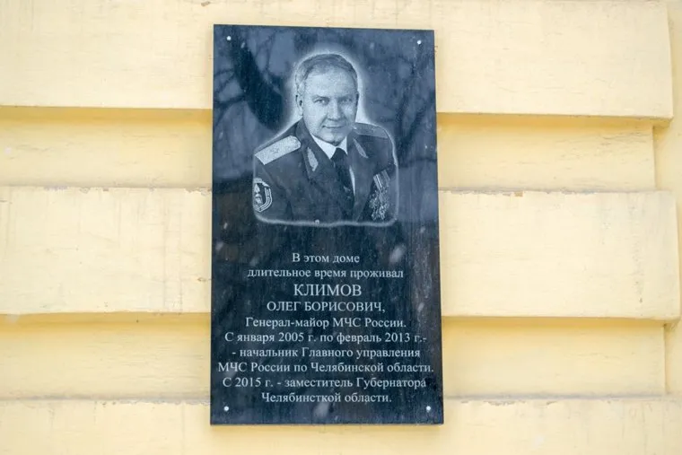 В Златоусте на одном из домов обнаружили мемориальную доску действующему вице-губернатору, министру общественной безопасности Олегу Климову. Пост в с фотографией доски выложил в своем Facebook (деятельность запрещена в РФ) челябинский краевед Юрий Латышев.