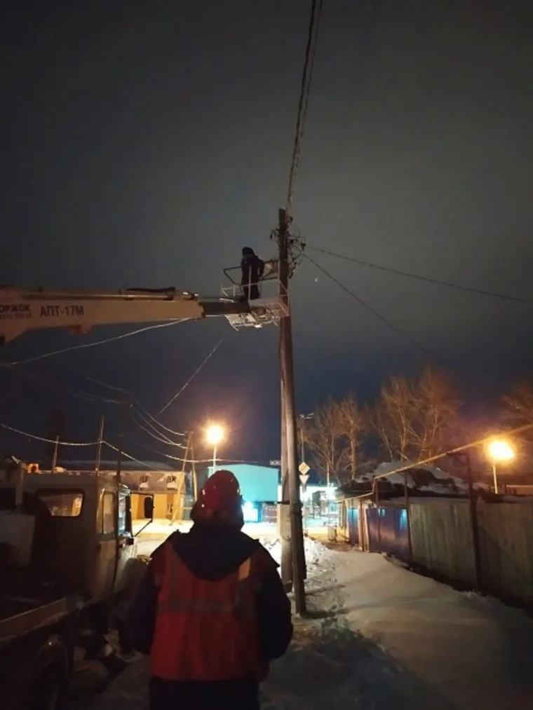 Электромонтеры Павел Фафин и Евгений Рыбаков устраняют повреждение на ВЛ 0,4 кВ Заозерного района электрических сетей