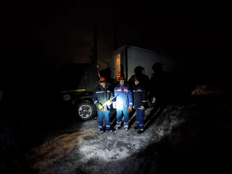 Электромонтеры Анатолий Кочуров, Сергей Серяков и Александр Южаков из бригады службы ВЛ после 22 часов работы с перерывом на пополнение запаса материалов для устранения последствий сложных метеоусловий