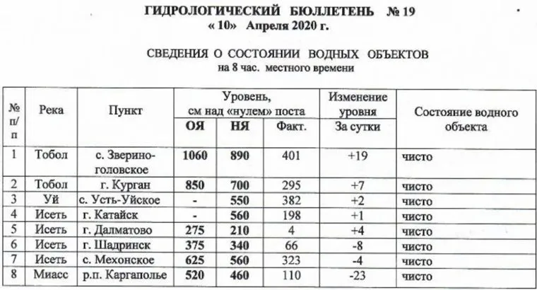 По данным на утро 10 апреля уровень воды в Тоболе в районе Кургана составил 295 см (рост за сутки на 7 см), в районе Звериноголовского — 401 см (+19 см за сутки). На реке Исеть в районе Катайска и Далматово отмечается незначительный рост, в районе Шадринска — снижение. Река Миасс в районе Каргаполья за сутки опустилась на 23 см.