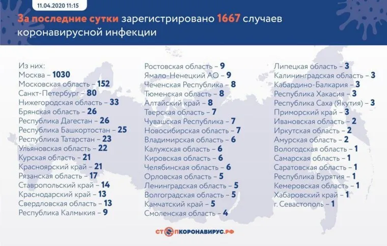 «За последние сутки в России подтверждены 1667 случаев новой коронавирусной инфекции в 49 регионах», — говорится в сообщении. Всего вылечились 1045 пациентов, умерли 106 человек (12 за последние сутки).