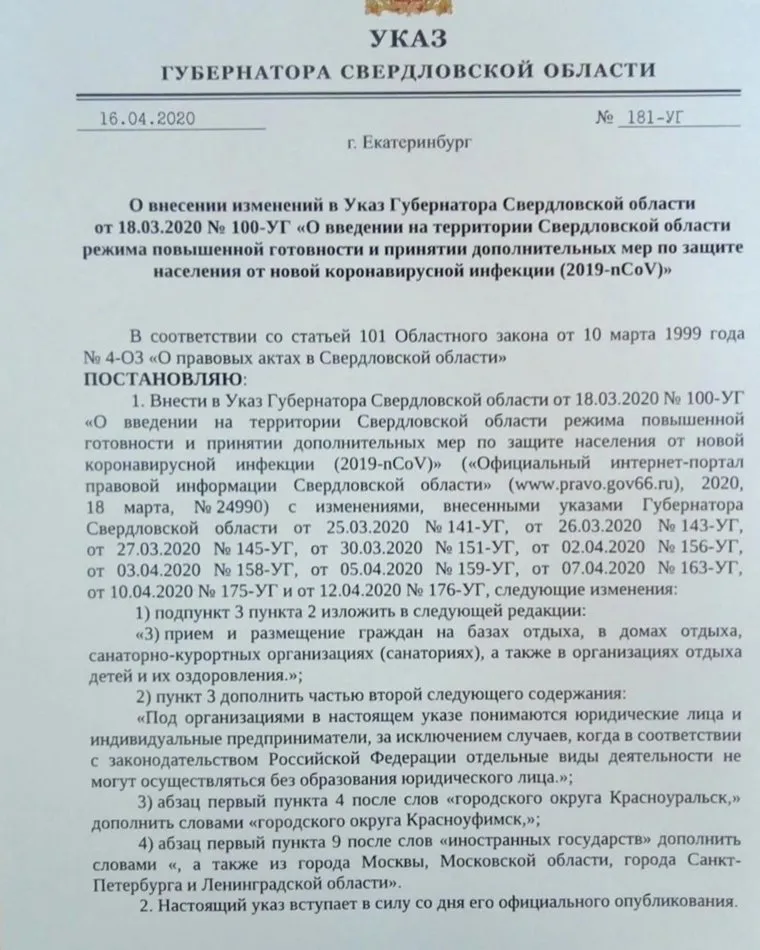 Указ губернатора, устанавливающий новые правила жизни для свердловчан