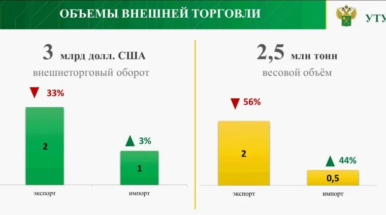 Внешнеторговый оборот регионов, входящих в Уральский федеральный округ, упал с начала года на 50 процентов. Об этом в ходе онлайн-брифинга журналистам сообщил глава Уральского таможенного управления Максима Чмора. За первый квартал 2020 года оборот составил 2,5 млн тонн грузов или 3 млрд долларов, снижение товарооборота в денежном выражении составило 33 процента.