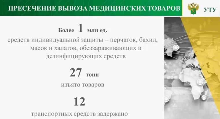 Уральские таможенники пресекли вывоз миллиона единиц средств индивидуальной защиты. Об этом журналистам сообщил начальник Уральского таможенного управления Максим Чмора. Груз задержан на границе с Казахстаном.