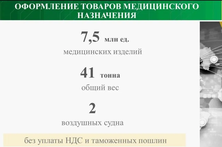 «Эти товары проверяются с минимальными требования: чаще всего все ограничивается проверкой документов», — заявил руководитель Уральской таможни, приведя в пример недавнее прибытие груза масок из Китая для свердловских больниц. — Оформление было осуществлено еще до того, как завершилась разгрузка воздушных судов».