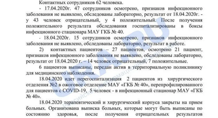 17 апреля был определен круг контактных лиц сестры-хозяйки — их оказалось 62 человека. Из них удалось обследовать 47, результаты анализов от 18.04: у 43 тест отрицательный, у четырех — положительный (лица с подтвердившимся диагнозом помещены в ГКБ №40).