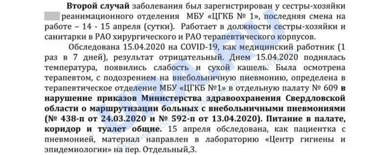 В результате возник второй случай, описанный в документе. Так, впоследствии зафиксировано заболевание у сестры-хозяйки реанимационного отделения. Ее последняя рабочая смена — с 14 на 15 апреля. 15.04 была обследована на COVID-19 как медработник (раз в 7 дней), результат был отрицательный. Днем 15 числа у нее поднялась температура, появились слабость и кашель — ее осмотрел терапевт, женщину с подозрением на пневмонию положили в терапевтическое отделение ЦГКБ №1 — « в нарушение приказа о маршрутизации больных с внебольничными пневмониями », — отмечается в аналитической записке (должны были отвезти в ГКБ №24) Анализ на COVID-19 от 16 апреля уже дал положительный результат. Поздно вечером 16.04 ее перевели в ГКБ №40.