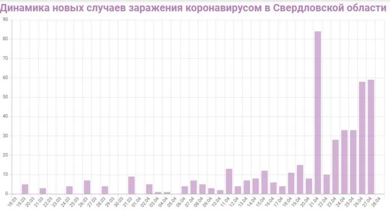 85 новых случаев за сутки — это рекордный рост заболеваемости для Свердловской области: прежний рекорд был установлен после вспышки коронавирусной инфекции в ГКБ №1 — тогда за сутки диагноз выявили у 78 человек . В последние дни фиксировался рост заболеваемости около 60 человек в сутки (58 — 27.04, 59 — 27.04), до этого темп роста держался примерно по 30 человек в день (28 — 23.04, по 33 — 24 и 25 апреля — см. ИНФОГРАФИКУ).