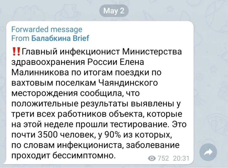 Заместитель председателя правительства Якутии Ольга Балабкина заявила, что у трети работников Чаяндинского месторождения (принадлежит «Газпром добыча Ноябрьск» — прим.ред.) выявлен коронавирус. Однако спустя несколько часов она удалила свой пост в Telegram.
