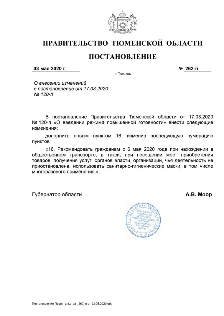 Ранее с предложением ввести масочный режим на территории региона к Моору обратилась глава управления Роспотребнадзора по Тюменской области Галина Шарухо. По ее словам, это необходимо, потому что не все тюменцы соблюдают социальную дистанцию и используют средства защиты. В результате постановление правительства Тюменской области «О введении режима повышенной готовности» было дополнено новым пунктом.