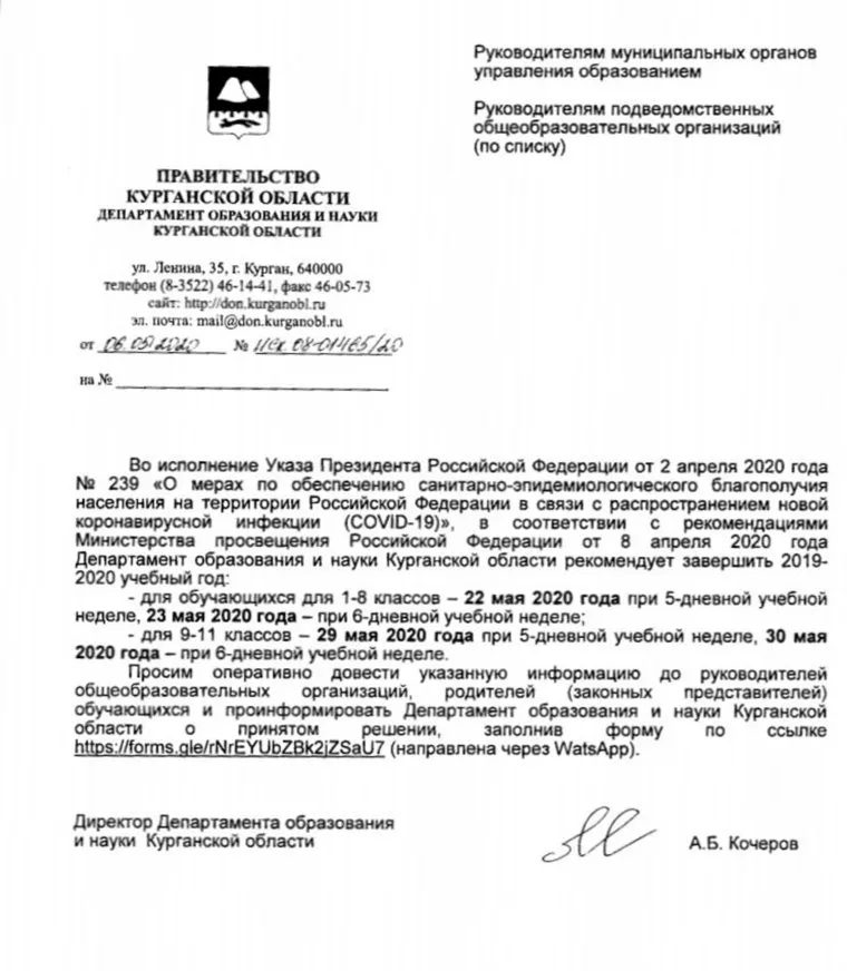 Школам Курганской области рекомендовано завершить учебный год и уйти на летние каникулы досрочно. Письмо руководителям муниципальных органов управления образованием и общеобразовательных организаций, подписанное директором регионального департамента образования Андреем Кочеровым, опубликовано на сайте ведомства.