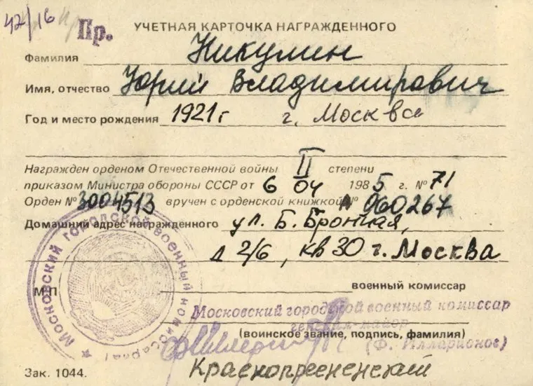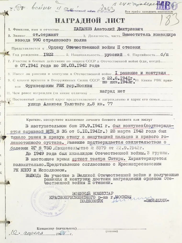 Минобороны РФ показало документы актеров-фронтовиков. Среди них — Никулин, Этуш и Папанов