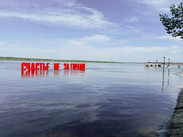 Знаменитый пермский арт-объект «Счастье не за горами» снова частично скрылся под водой. Каждый год весной камская ГЭС сбрасывает воду, из-за чего река выходит из берегов.