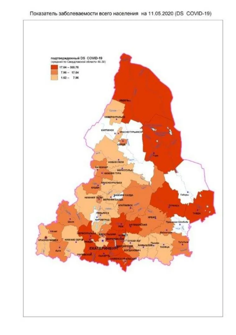 По данным санитарных врачей (последняя сводка — за 11 мая), больше всего случаев заражения COVID-19 выявлено в Екатеринбурге (1255), в Полевском (57), Нижнем Тагиле (47), Красноуфимске, Камышлове и Камышловском районе (35), Ревде (31) Березовском (29), Первоуральске (38), Ирбите (24), Красноуфимске (23), Туринске (21), по 17 — в Асбесте, Артемовском и Реже, 16 — в Верхней Пышме, 15 — в Каменск-Уральском, 14 — в Белоярском районе, 11 — в Серове, по 10 — в Заречном и Арамили, 8 — в Сысерти, 7 — в Тавде, 6 — в Богдановиче.