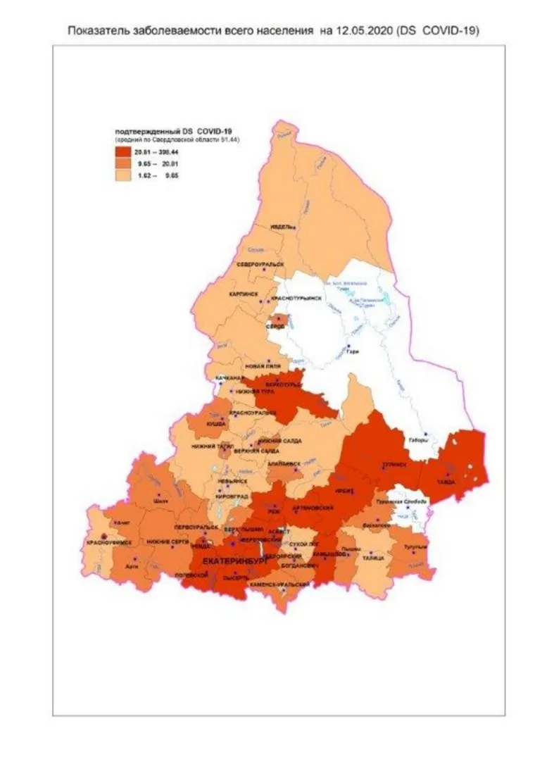 По данным санитарных врачей (последняя сводка — за 12 мая), больше всего случаев заражения COVID-19 выявлено в Екатеринбурге (1402), в Полевском (60), Нижнем Тагиле (58), Камышлове и Камышловской районе (39), Ревде (34), Первоуральске (31), Березовском (29), Красноуфимске (26), Ирбите (25), Туринске (21), Верхотурье (20), Артемовском и Верхней Пышме (18), Асбесте и Реже (17), Каменске-Уральском (16), Белоярском районе (14), Серове (14), Арамили и Заречном (10), Тавде и Сысерти (8), шесть — в Богдановиче, по пять — в Алапаевске и Верхнем Дуброво, по четыре — в Новоуральске, Режевском районе и Среднеуральске.