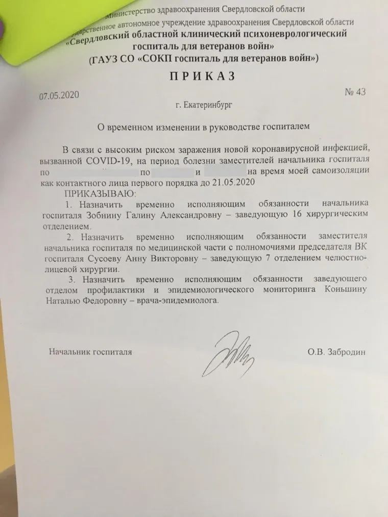 «В связи с высоким риском заражения новой коронавирусной инфекцией, вызванной COVID-19, на период болезни заместителей начальника госпиталя (далее указываются точные должности — прим. ред.) на время моей самоизоляции как контактного лица первого порядка до 21.05.2020 приказываю назначить временно исполняющим обязанности начальника госпиталя Зобнину Галину Александровну — заведующую 16 хирургическим отделением», — говорится в документе.