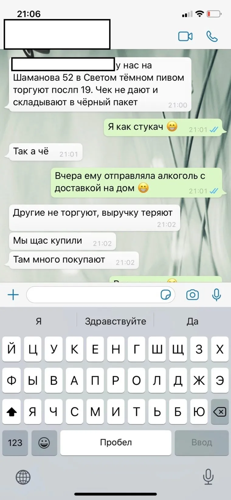 Жительница микрорайона Академический Евгения написала, что по адресу ул. Шаманова, 52 торгуют спиртным после 19 часов. В доказательство она выслала переписку со смартфона, где один из покупателей «хвастается» приобретением пенного напитка, отмечая, что там «многие покупают». «Чек не дают и складывают [спиртное] в черный пакет», — признался тайный покупатель.