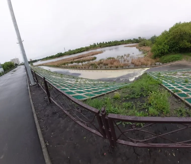 На фото девушки видно, что вода залила нижнюю часть набережной. Также можно заметить, что на покрытом бетоном и камнями декоративном участке, который разделяет ярусы набережной, проклюнулась трава. Другой житель города заметил, что вода могла остаться не после дождя: «Судя по фото, там Тобол вровень с набережной, и вода эта из Тобола после паводка».