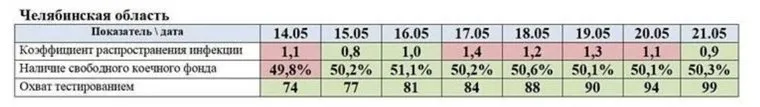 Для ослабления карантина требуется соответствовать трем критериям. Коэффициент распространения инфекции не может превышать 1,0. В регионе должно быть не менее 50% свободного коечного фонда от общего числа заболевших, а охват тестированием не менее 70 на 100 тыс. населения в день. Первый показатель на 21 мая для Челябинской области составляет 0,9, второй — 50,3%, третий — 99 тестов на 100 тыс. жителей.
