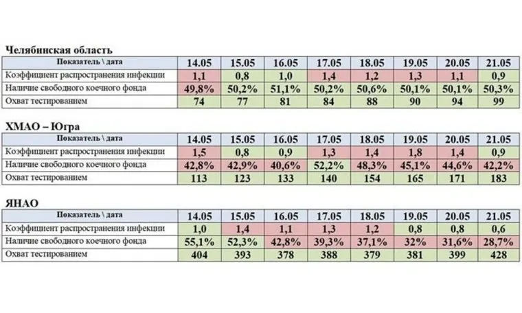 Показатели ухудшаются также в Ямало-Ненецком автономном округе: здесь восьмой день подряд сокращается число свободных коек, по данным на 21 мая осталось 28,7%, в то время как 14 мая были свободны 55.1% коек.