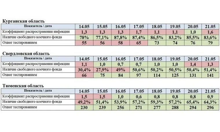 URA.RU сообщало, что для поэтапного снятия ограничений регионам необходимо выполнять три критерия: коэффициент распространения инфекции (сколько человек заражает один больной) — не может превышать 1,0, в больницах должно быть не менее 50% свободных коек для ковид-пациентов, а лаборатории проводить более 70 тестов на 100 тысяч населения в сутки.