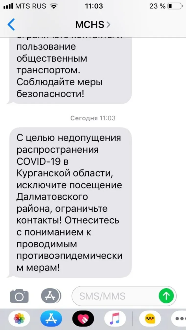 В пресс-службе ГУ МЧС по Курганской области подтвердили достоверность этого сообщения, заявив, что текст SMS получили из регионального оперативного штаба по борьбе с коронавирусом. В ведомстве добавили, что все сообщения с предупреждениями о мерах профилактики заражения COVID-19 получают из штаба, который использует возможности МЧС по массовой рассылке сообщений. URA.RU обратилось за комментариями в оперативный штаб, на момент публикации ответ не поступил.