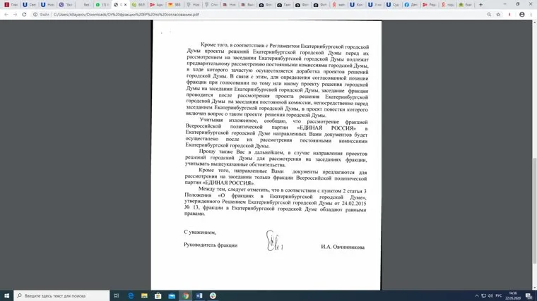 «Рассмотрение фракцией ВПП „Единая Россия“ направленных вами документов будет осуществлено [только] после после их рассмотрения постоянными комиссиями ЕГД. Прошу также вас в дальнейшем, в случае направления проектов решений городской думы для рассмотрения на заседаниях фракции, учитывать вышеуказанные обстоятельства», — написала Овчинникова.