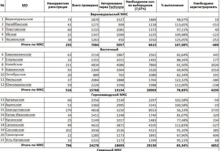 В Челябинске самые низкие показатели пока в Курчатовском — 27%, в Центральном — 30,7% и в Металлургическом районах — 39,75%. Ни один район областного центра пока не достиг нужного результата, самый высокий показатель в Советском — 64,4%. По Челябинску этот показатель составил 44,5%. В Миассе единоросы выполнили план по выборщикам пока только на 46%.