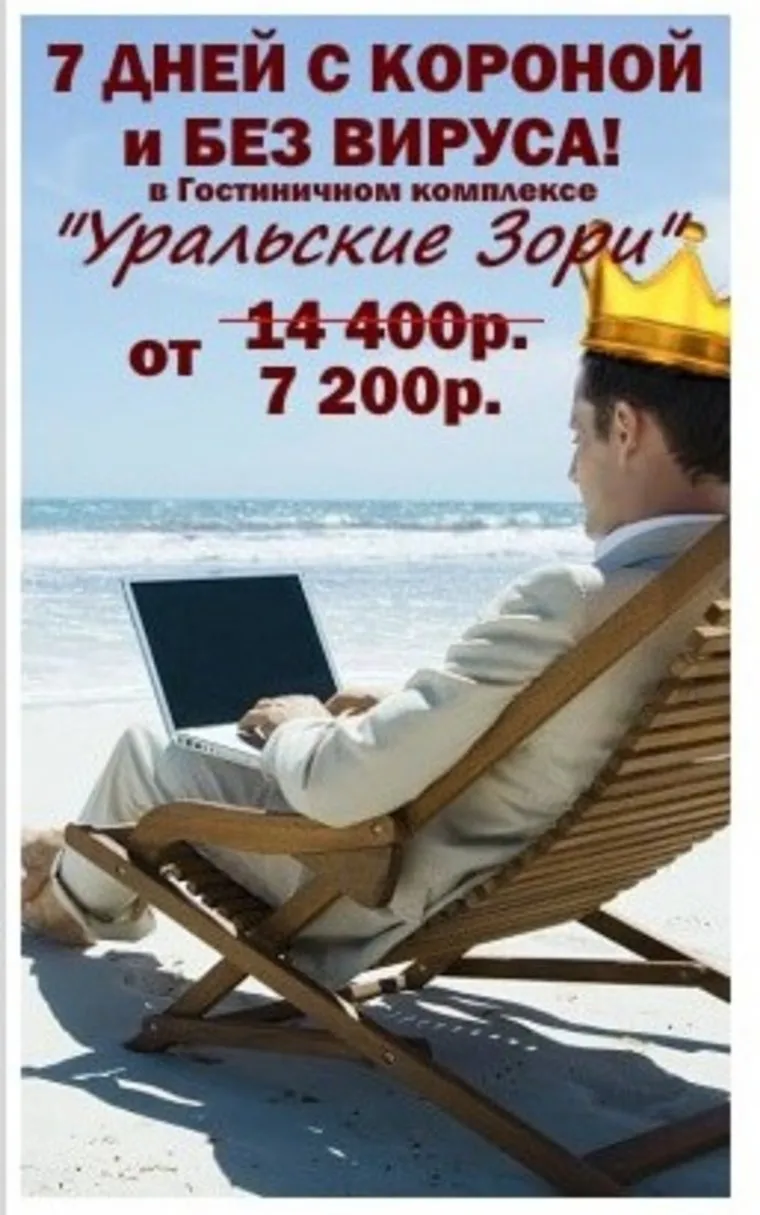 Баннер с изображением сидящего в шезлонге мужчины в короне и слоганом на фоне «7 дней с короной и без вируса» появился в интернете в марте, когда пандемия дошла до России. По заключению экспертов-филологов «текстовое содержание рекламы противоречит принятым в обществе нравственным и морально-этическим нормам», формирует несерьезное отношение к проблеме и может расцениваться как неприемлемое и некорректное в ситуации стремительного распространения инфекции.