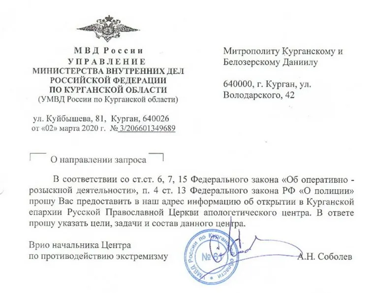 «Последователь оккультно-языческого учения Концепция Общественной Безопасности из Шумихинского района (Курганская область) обратился в правоохранительные органы с требованием возбудить уголовное дело в отношении митрополита Курганского и Белозерского Даниила», — объяснили в пресс-службе епархии. Весной в Курганскую епархию поступило пять запросов от сотрудников правоохранительных органов.