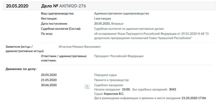 Бывший глава Чувашии Михаил Игнатьев подал иск к президенту Владимиру Путину, намереваясь оспорить решение о своей отставке. Иск уже поступил в Верховный суд, первое заседание по делу назначено на 30 июня, следует из картотеки судебных дел.