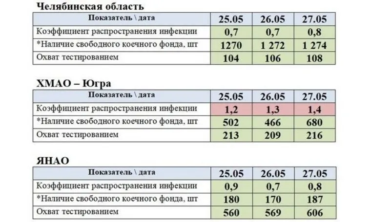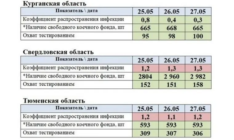 В Курганской и Челябинской области, Ямало-Ненецком автономном округе выполнены все требования по количеству свободных коек для коронавирусных больных, коэффициенту распространения вируса и числу проведенных тестов.