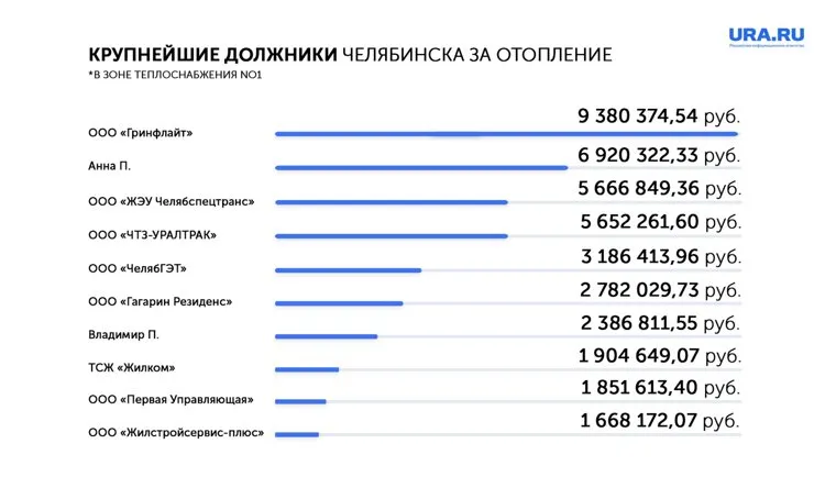 По 5,6 млн должны управляющая компания «ЖЭУ Челябспецтранс» и известный завод «ЧТЗ-Уралтрак». «ЧелябГЭТ» (управляет городским электротранспортом) должно 3,1 млн рублей. Компания «Гагарин Резиденс», управляющая домом отдыха с подземной парковкой, не оплатила счета на 2,8 млн рублей. В списке крупнейших должников также ТСЖ «Жилком» (1,9 млн рублей), «Первая Управляющая» (1,8 млн рублей), «Жилстройсервис-плюс» (1,7 млн рублей).