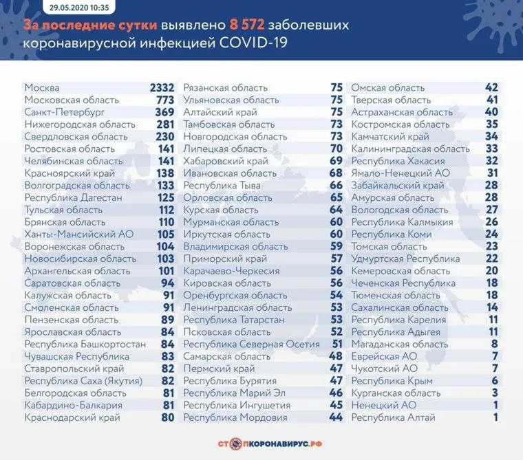 «За последние сутки выявлено 8572 инфицированных», — говорится в сообщении штаба. За сутки выздоровели 8264 человека, умерли 232 пациентов. Больше всего зараженных зафиксировано в Москве (2332), Московской области (773) и Санкт-Петербурге (369).